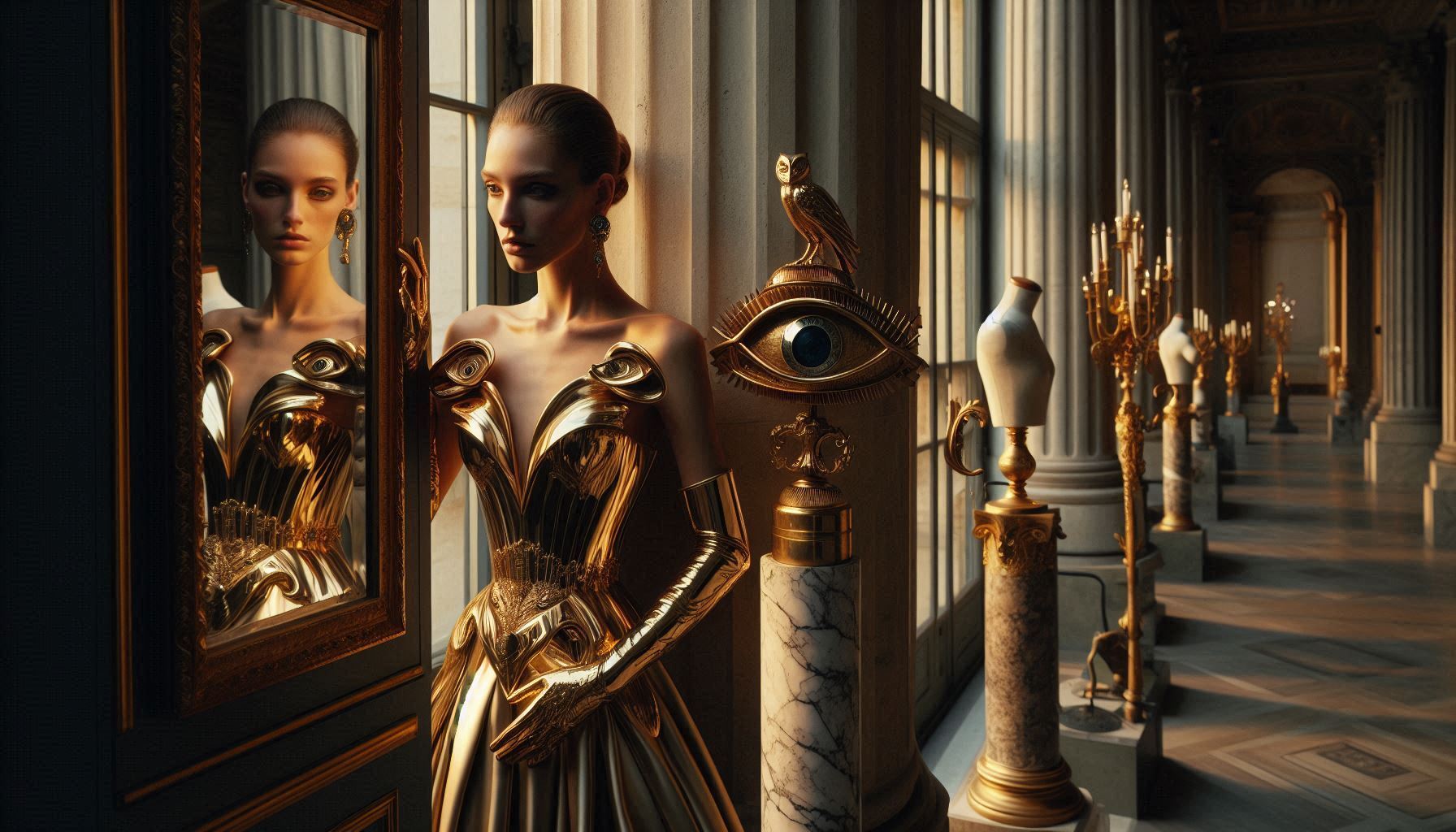 Haute Couture (by appointment) — sculpted volumes, gilded anatomy, celestial embroidery
